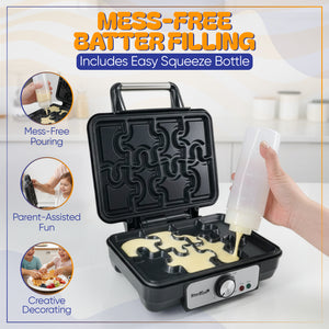 - MESS-FREE FILLING WITH EASY SQUEEZE BOTTLE - Comes with an easy-fill squeeze bottle that makes pouring batter simple and precise. Perfect for little helpers and creative decorating, helping keep your kitchen clean while making breakfast more interactive.